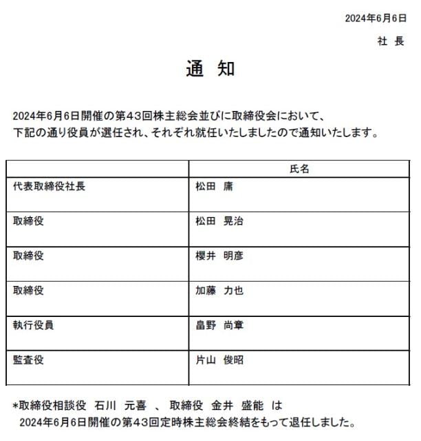 6月6日開催の第43回定時株主総会並びに取締役会において役員が選任され就任いたしました。