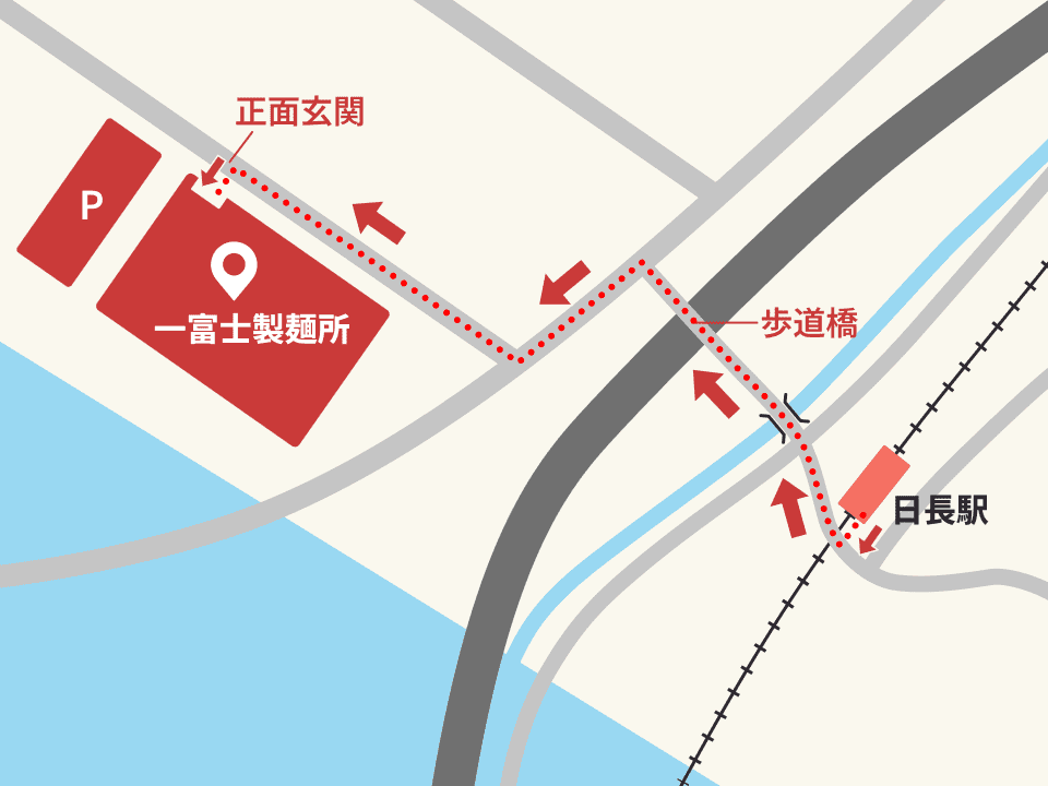 - 改札を出て踏み切りを渡ったら、右方向に進む