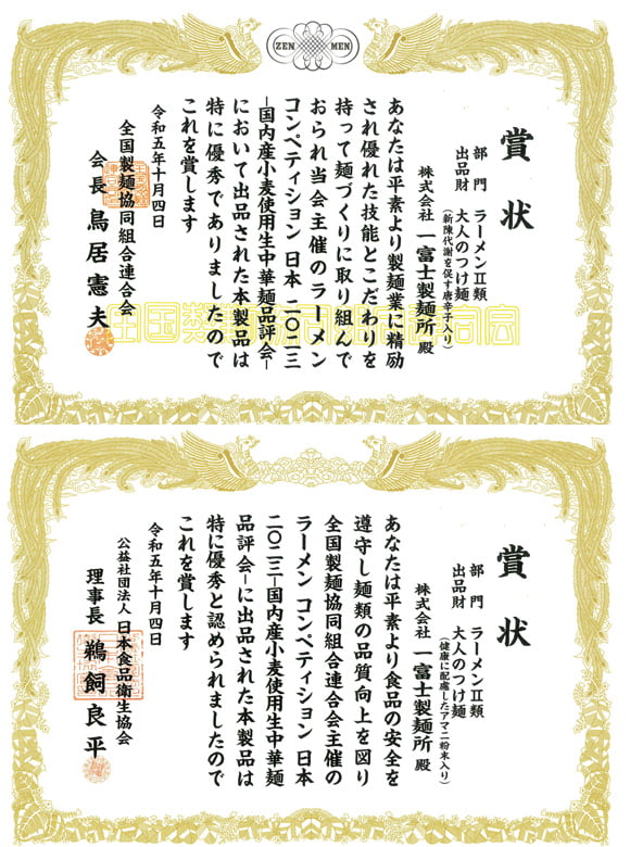 全国製麺協同組合連合会が主催する「ラーメンコンぺティション日本2023」において、当社が企画・製造した商品2品が優秀と認められ受賞いたしました。