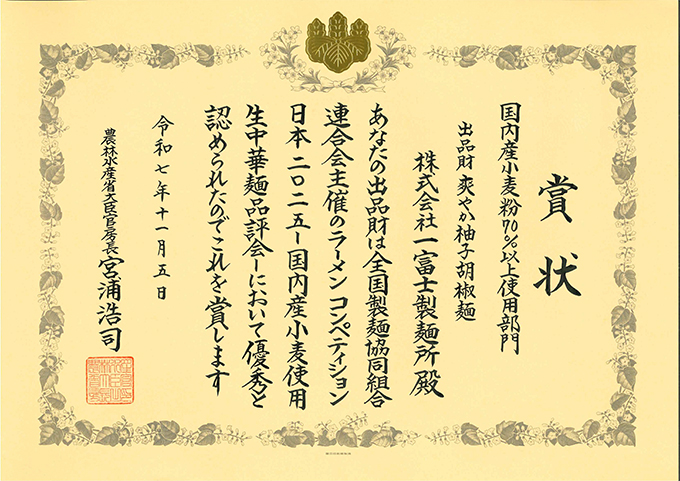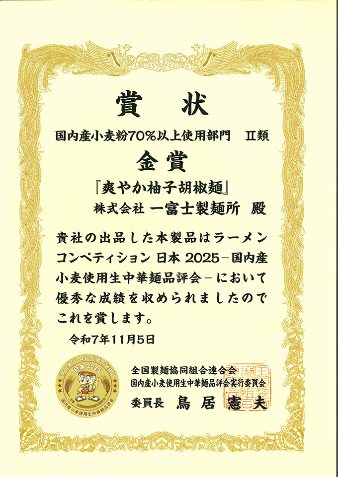全国製麺協同組合連合会が主催する『ラーメンコンぺティション日本2025』において、当社が企画・製造した商品が優秀と認められ受賞いたしました。