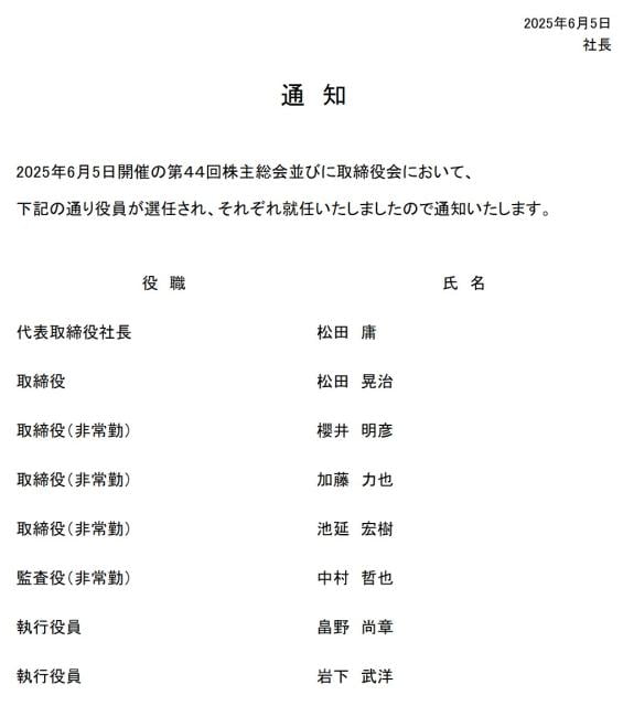 6月5日開催の第44回定時株主総会並びに取締役会において役員が選任され就任いたしました。